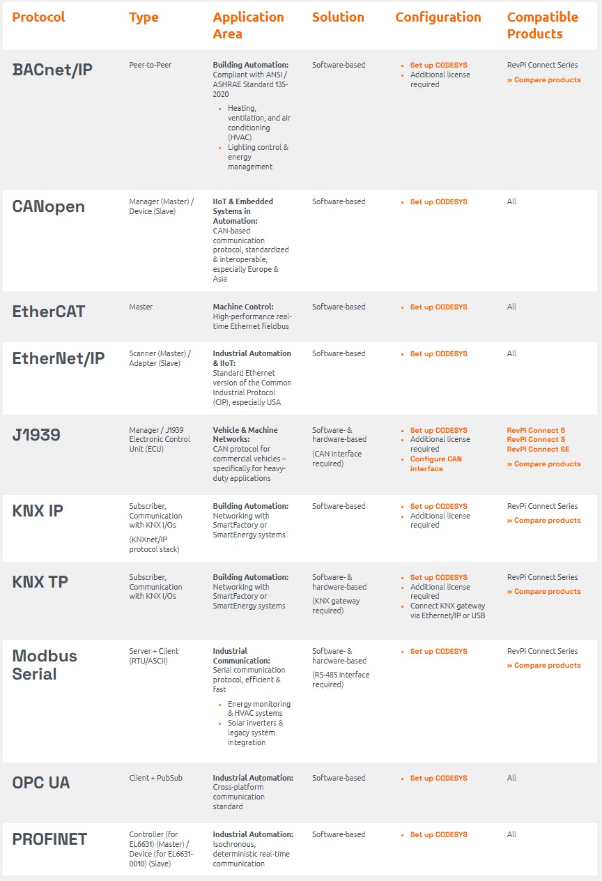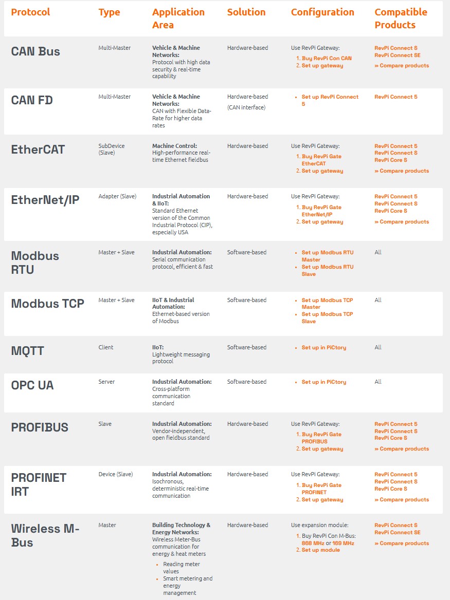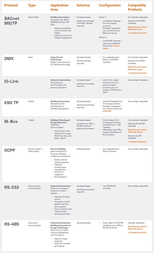 Revolution Pi platformu açık olduğundan, üçüncü taraf donanımlar aracılığıyla ek protokoller entegre edilebilir.