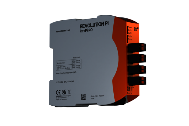 RevPi RO, dört potansiyelsiz normalde açık (NO) rölesağlar. Her röle, maksimum 250 V AC veya 30 V DC'de 5 A'ya kadar yükleri anahtarlar.